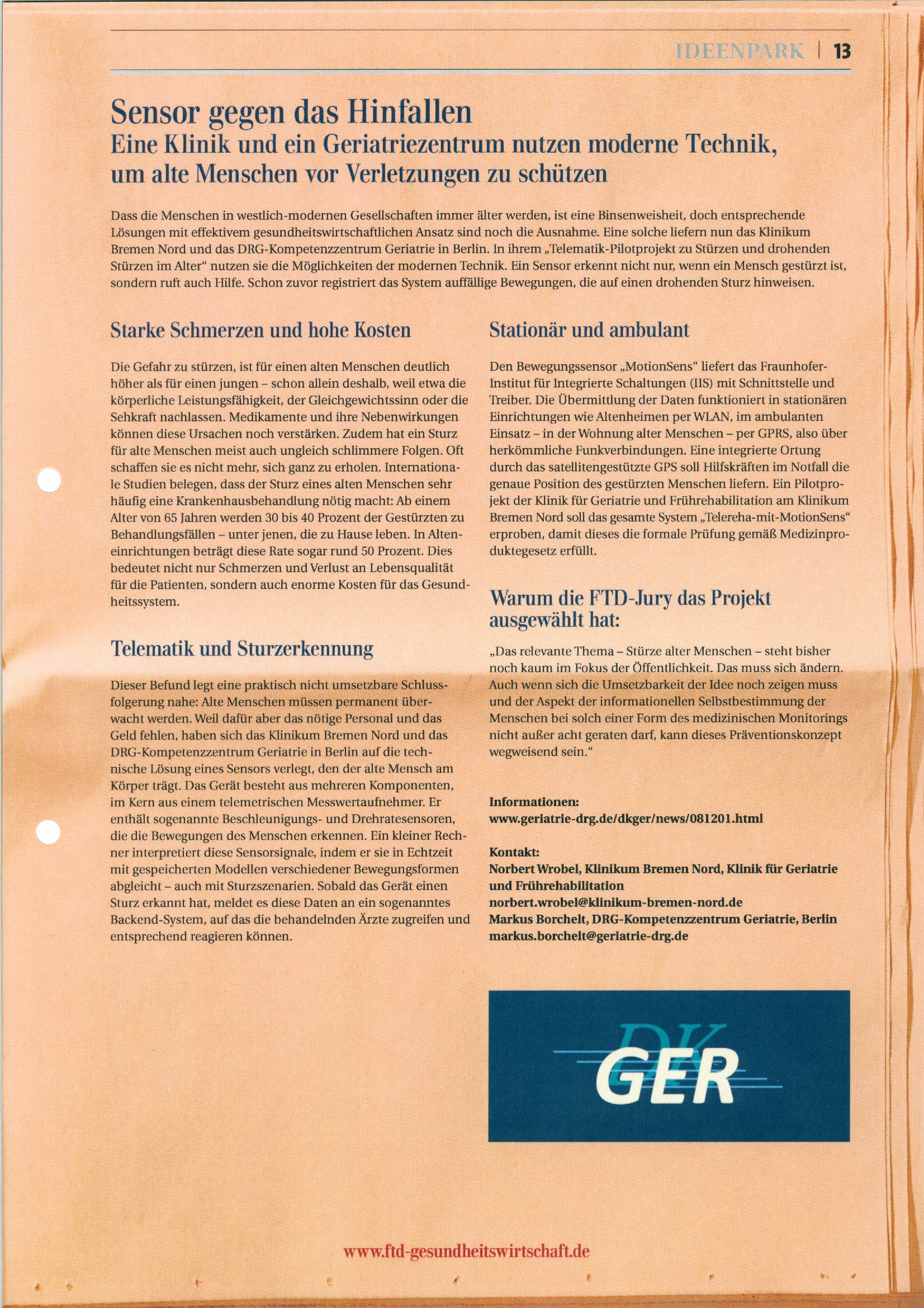 Überdies registriert das System auffällige Bewegungen, die auf einen drohenden Sturz hinweisen. Den dazugehörigen Bewegungssensor Motionsens liefert das Fraunhofer-Institut für Integrierte Schaltungen. Die Übermittlung der Daten funktioniert via Internet oder Funk. Bislang handelt es sich noch um ein Pilotprojekt, dessen Umsetzbarkeit sich erst zeigen muss. Auch die informationelle Selbstbestimmung muss bei derartigen Formen der Überwachung künftig Diskussionsthema sein. Dennoch, so urteilte die FTD-Jury, kann dieses Präventionskonzept wegweisend sein.