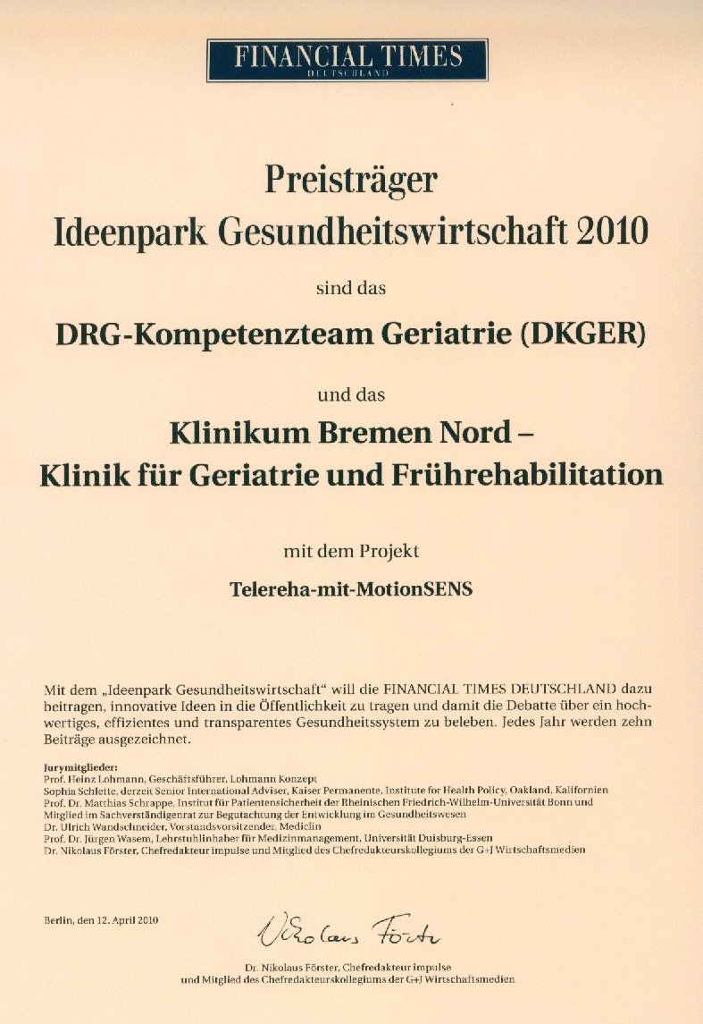 Bereits am 12.04.2010 waren die Gewinner des diesjährigen Ideenparks anlässlich der FTD-Konferenz "Gesundheitswirtschaft 2010" vorgestellt und mit der Übergabe der Preisurkunde geehrt worden.